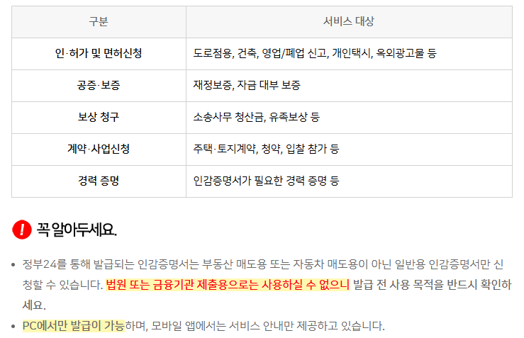 - 사용처 : 인·허가 및 면허 신청, 공증·보증, 계약·사업 신청 등 다양한 곳에서 사용할 수 있습니다.