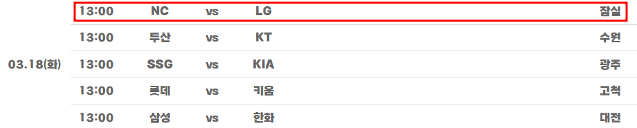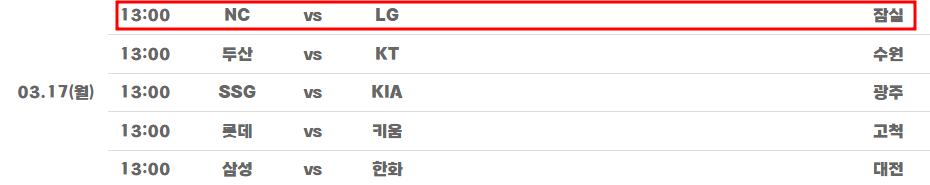 LG 잠실구장 경기는 3월 17일(월) , 18(화) 13:00 NC와 경기가 있습니다.